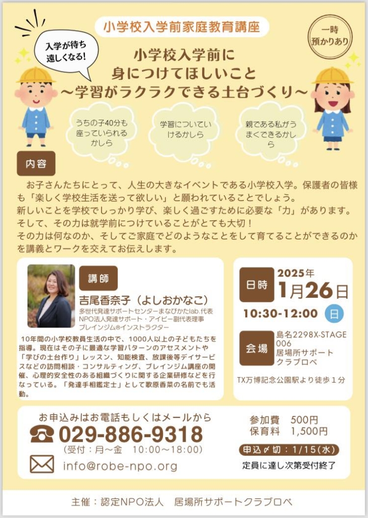 こんにちは 学童保育アフタースクールロベです。 小学校入学前家庭教育講座のお知らせです。 「小学校入学前に身につけてほしいこと」等について、元教員で公認心理師で… -