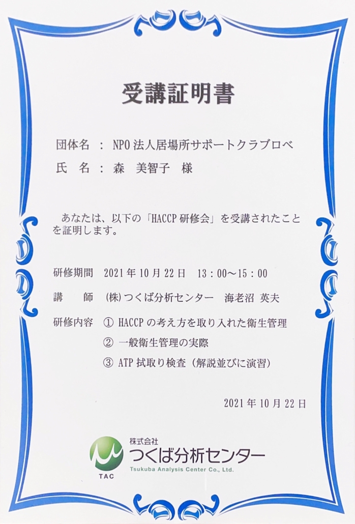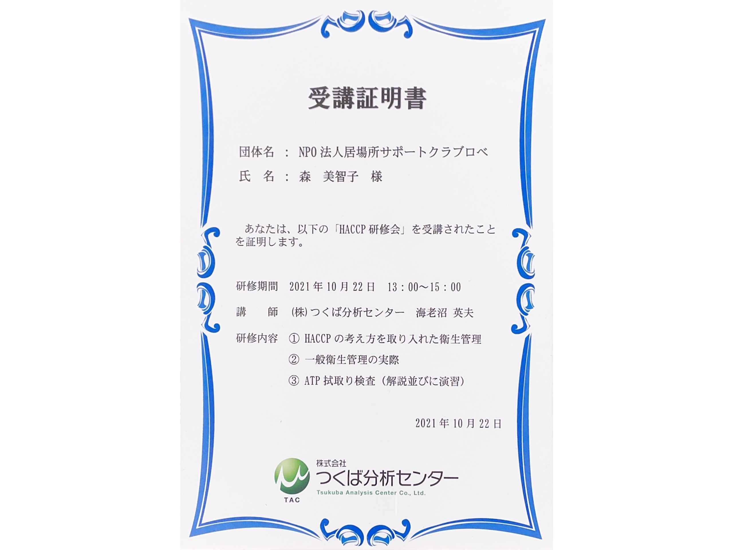 当法人はつくば分析センター様によるHACCP研修を受講済みです。