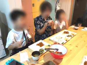 みんなでいただきますをして、檜のダイニングテーブルを囲み、美味しい食事を楽しんでおります。