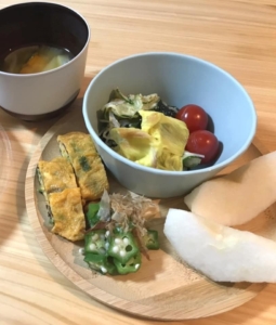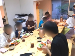 みんなでいただきますをして、檜のダイニングテーブルを囲み、美味しい食事を楽しんでおります。