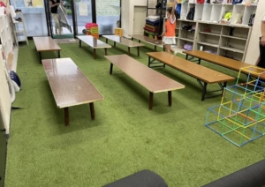 みんなで協力して、床のカーペットを全部剥がして、掃除して、人工芝を敷き詰めました。