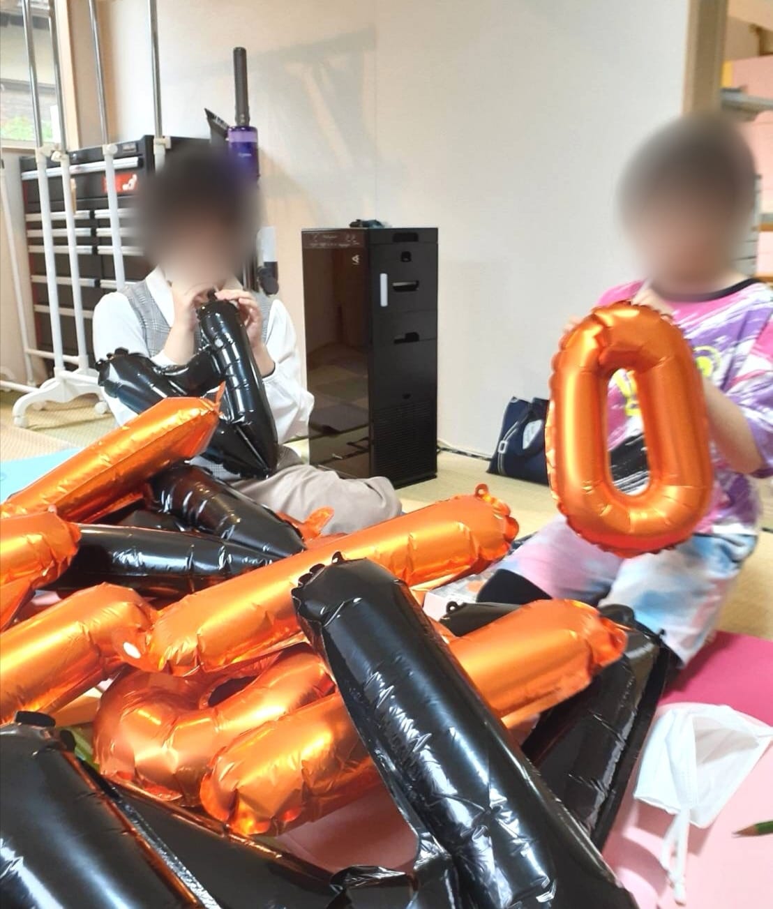 折り紙でクモの巣やコウモリ、カボチャ等を切って壁にはったり、HALLOWEEN風船を膨らませたり。