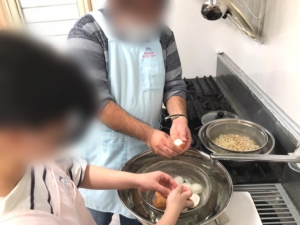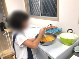子どもたちと一緒にキッチンに入り、卵をゆでる前に、卵穴あけ器を使い殻に穴を開け、殻をむけやすいようにしたり、卵カッターで細かく刻んだり、楽しく料理しております。
