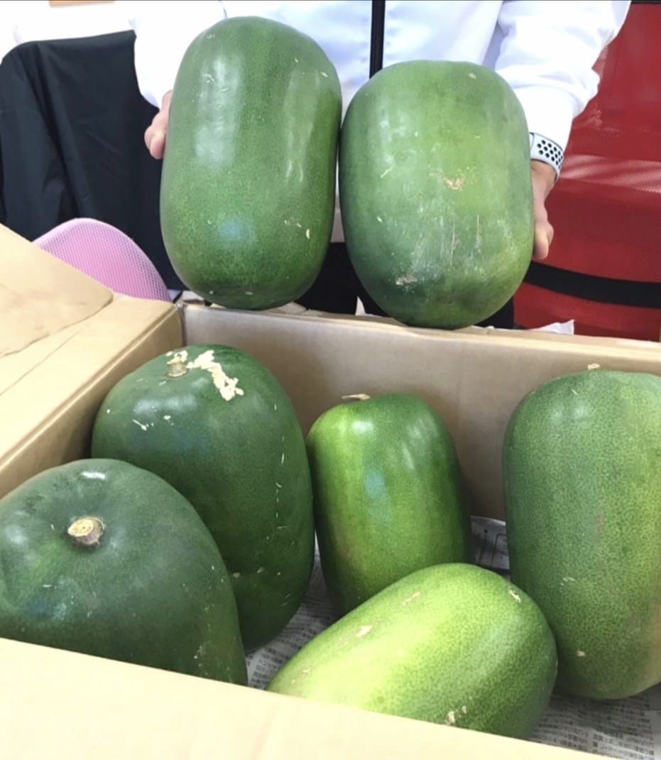 つくば分析センター様よりファーマーズマーケットなだろう様の大きな冬瓜をご寄付いただきました。