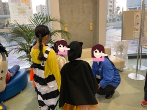雨具に絵を書いたり、マントにフェルトでデザインしたり、血のりやステッカーをを使って特殊メイクをしたりなど自分達で色々工夫しながら仮装を表現しました。