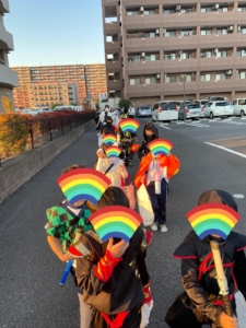 1人1人が素敵な仮装をし、【ハッピーハロウィン】と大きな声で歩きお菓子をもらいました