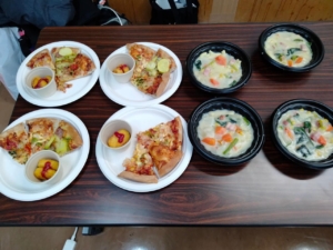 夕食はスマイル食堂様から、シチューとナゲットとケーキを
