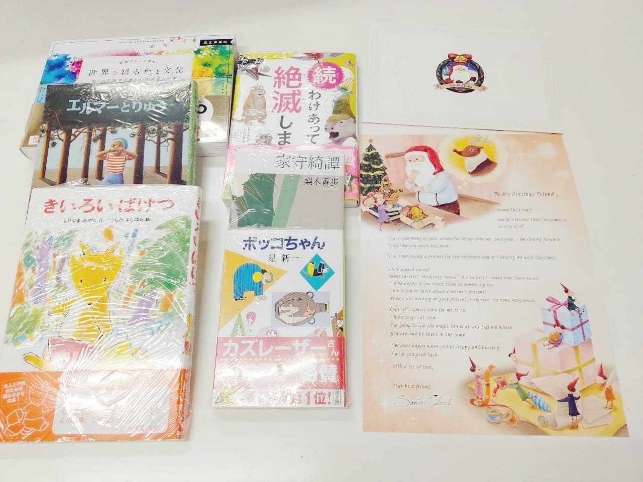 プレゼントは文具や食品等の詰合せの他、本を贈りました。