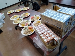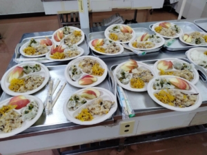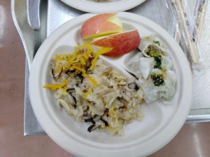 中華おこわ、水餃子、人参のハリハリ、りんごという中華風のご飯でした。
