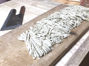 重い蕎麦切り包丁で慣れないながらも頑張って切っていました。