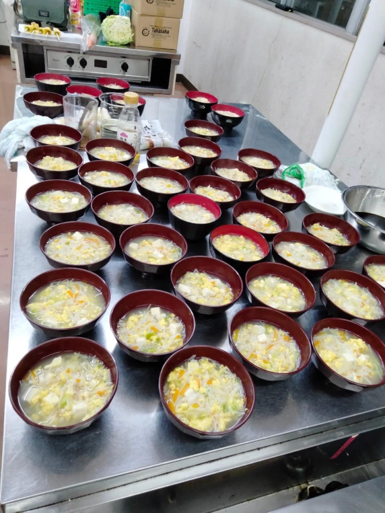 お楽しみのご飯はスマイル食堂様ご提供の肉ニラご飯とスープ!