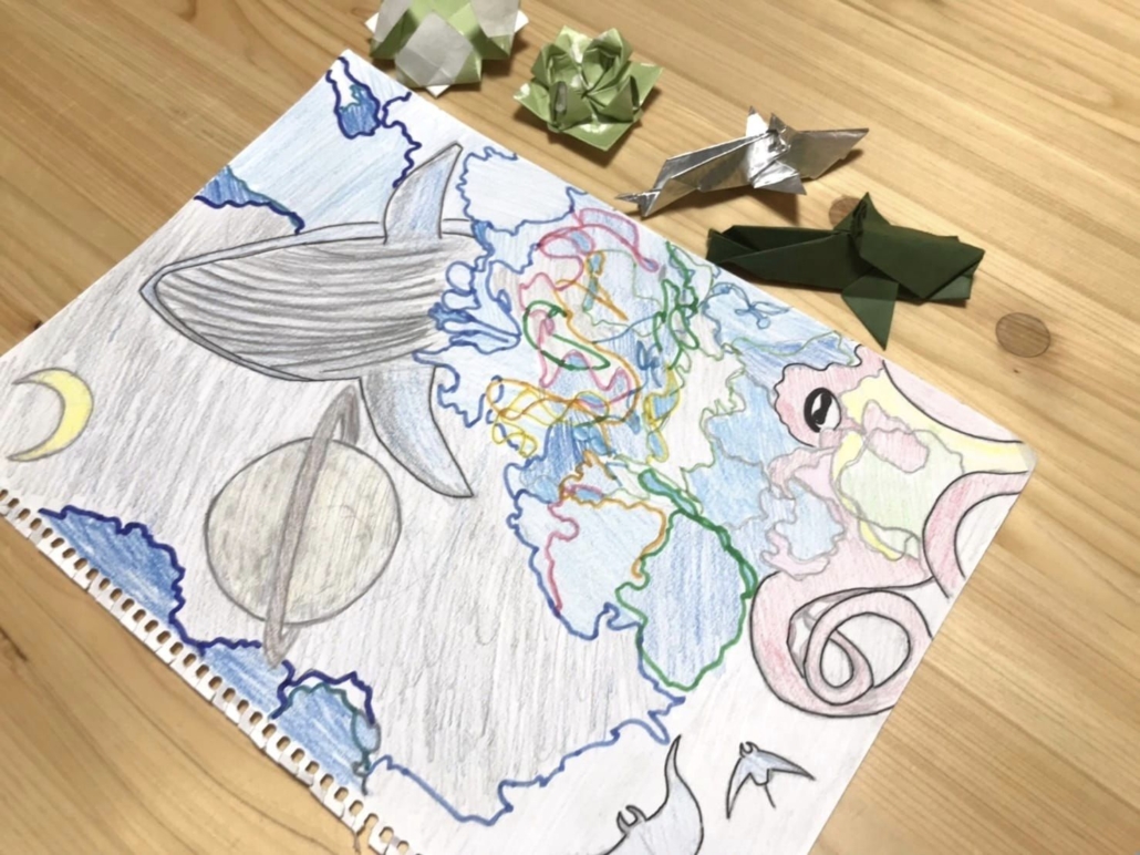 6月いっぱいでカフェ・ロベの仕事を退くスタッフに子どもたちが絵や折り紙のプレゼントを渡し、お別れしました。海・釣り好きのスタッフなのでとアーティスティックな海の絵や、鮫の折り紙を作ってきてくれていました