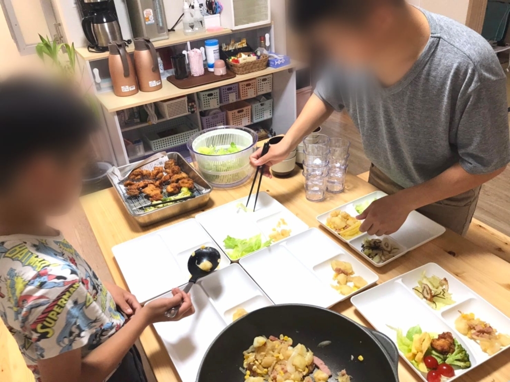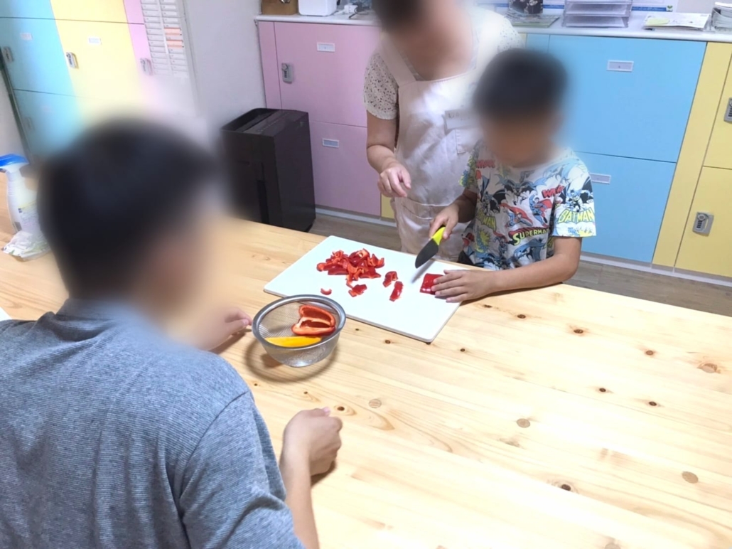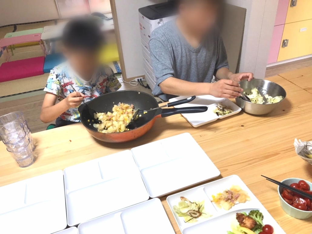 学校帰りの時間帯からなので、1から料理ができたわけではありませんが、野菜を切ったり、盛り付けをしたり、一部の工程を手伝ってもらいました。いつもは食べる専門の子も、楽しくご飯作りしてくれました。