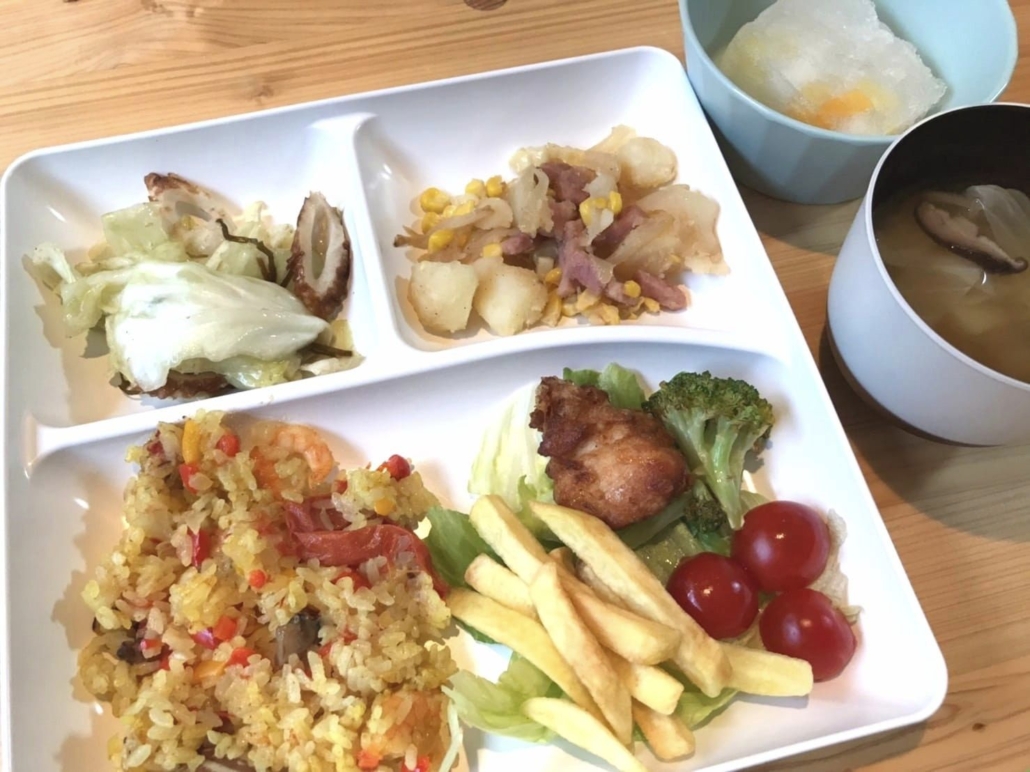 子どもたちと一緒に夕飯を作る機会をもうけました。カレー風パエリアと、ジャーマンポテトのメニューは子どもたちが話し合って決めました。