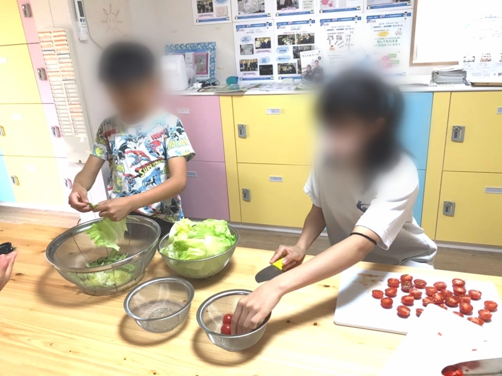 学校帰りの時間帯からなので、1から料理ができたわけではありませんが、野菜を切ったり、盛り付けをしたり、一部の工程を手伝ってもらいました。いつもは食べる専門の子も、楽しくご飯作りしてくれました。