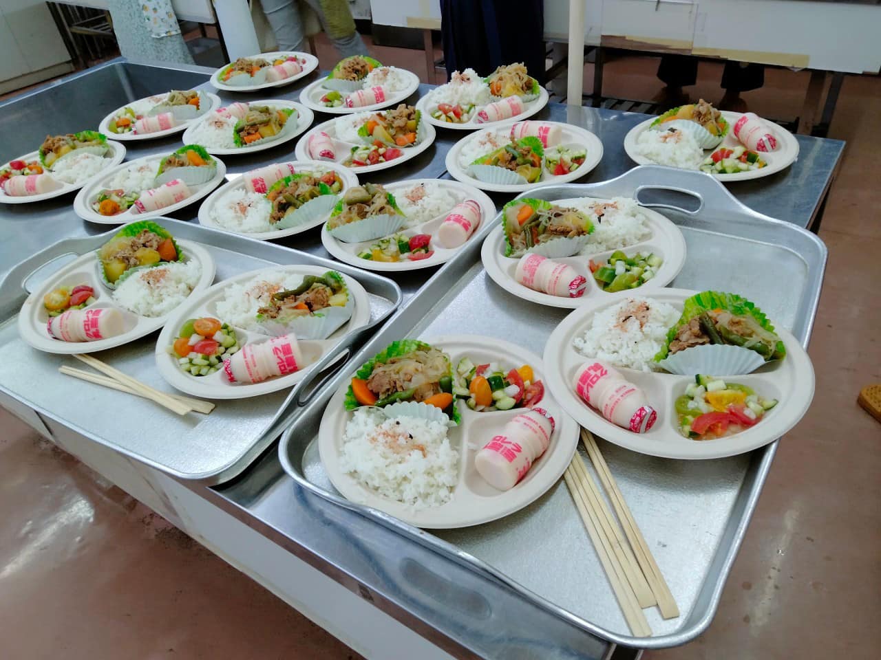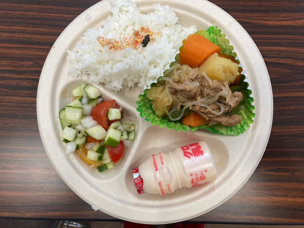 今日の食事は、竹園土曜ひろば様のご提供で、肉じゃがとサラダ、ライスと乳酸菌飲料のワンプレートでした。