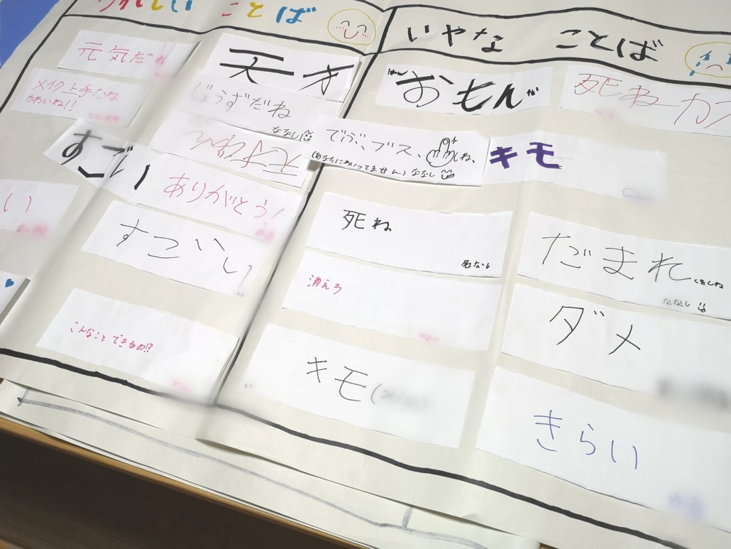 言われて嫌な言葉を書き出したことで、自分が傷つかない言葉でも、誰かにとっては傷つける言葉があることをみんなで確認しました。