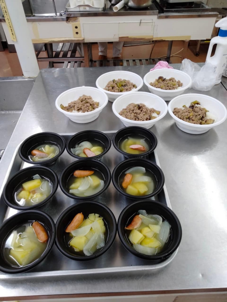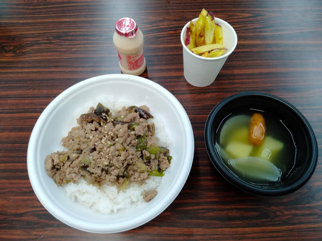 挽肉と茄子の炒め物をかけたご飯、じゃがいもと玉葱とソーセージのポトフ、さつまいも(シルキークイーン)のフライ、乳酸菌飲料でした。皆んな美味しくいただいていました。ご馳走様でした