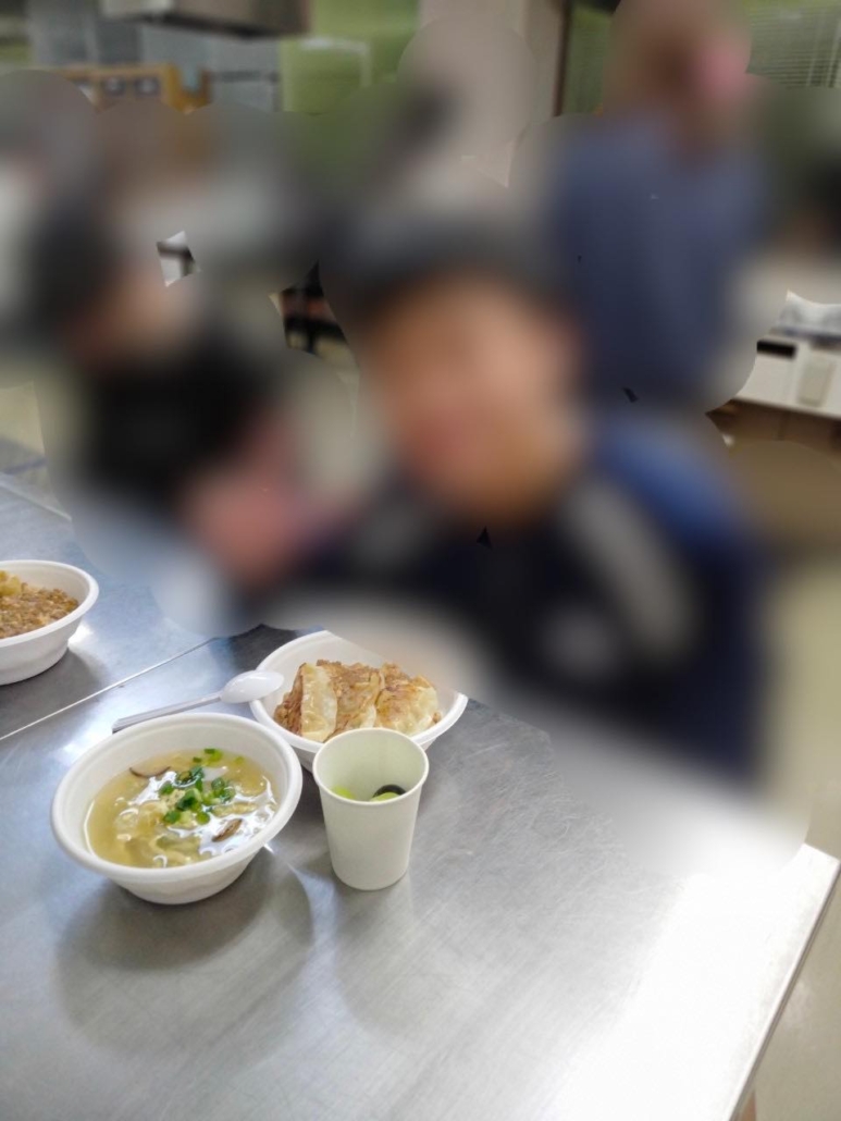 谷田部組様が餃子、麻婆豆腐、スープ、果物の食事を提供くださいました。