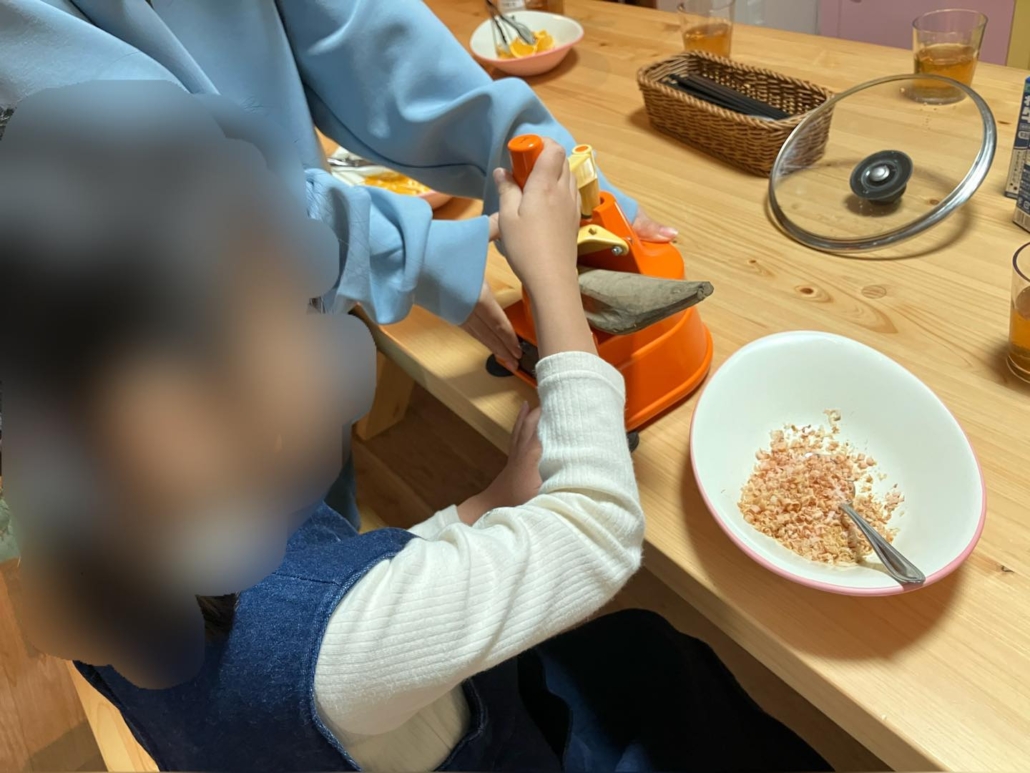 本枯鰹節をその場で削って、味噌汁のお出汁に使いました。子どもたちが順番に削ってくれました。引き立ては香りがたって美味しいです