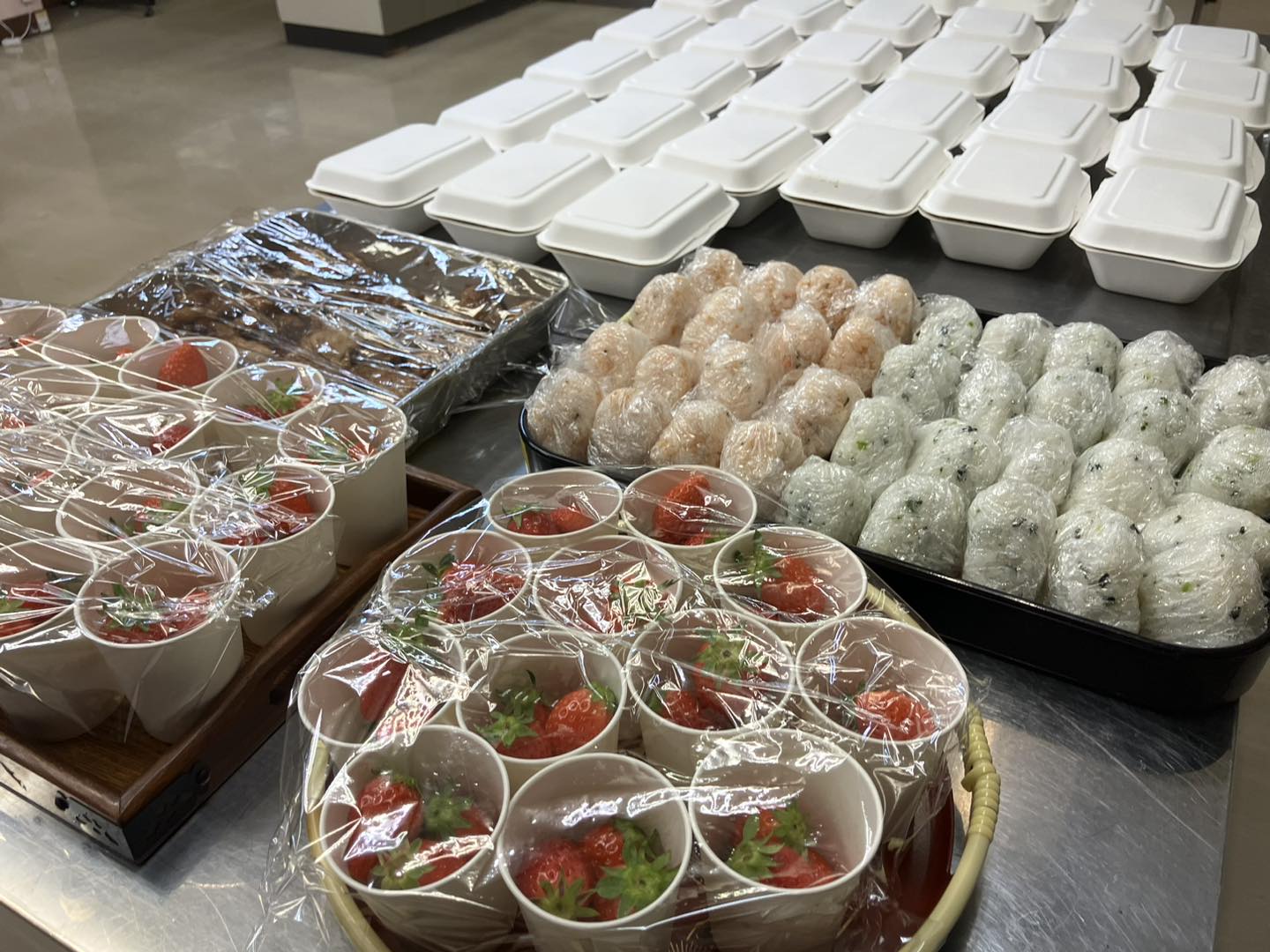 Gチェリー様より鶏の照り焼き弁当、豚汁、いちごをご提供いただきました。