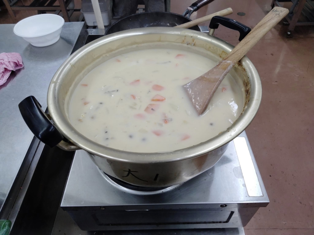 この日も子ども食堂の食事のご提供があり、ほうれん草が添えられた温かいクリームシチューとさけフレークご飯をおいしく頂きました。