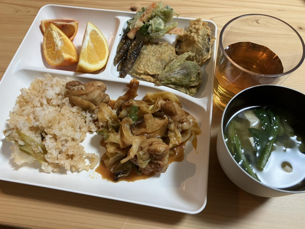 この日のメニューはチーズダッカルビ、明日葉ちくわのかき揚げ、ふきのとう・さつまいも天ぷら、果物、味噌汁。