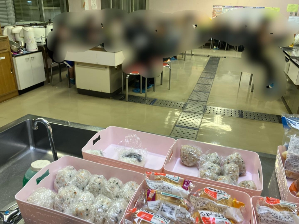 夕飯はおにぎりとパン。ボランティアさんがいつも温かいおにぎりを届けてくださるので助かっています。ご協力ありがとうございました♪