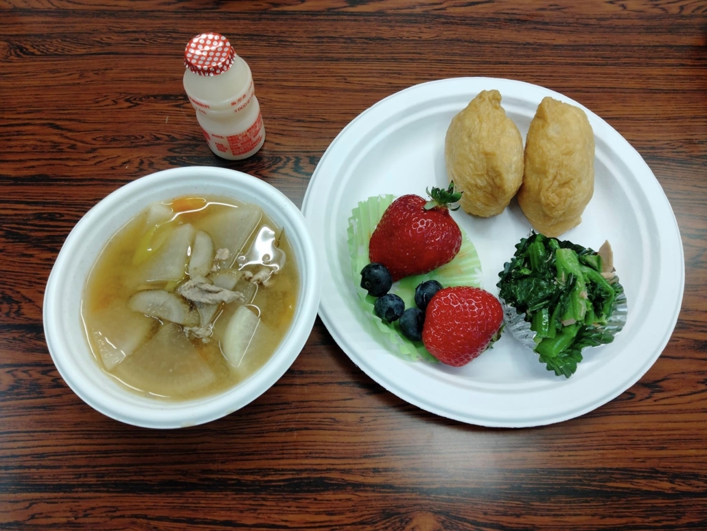 この日も子ども食堂の食事のご提供があり、おいなりさんと菜の花のおひたしにいちごとブレ―ベリーが添えられていて、彩りも良く、とても美味しく頂きました。豚汁も作って頂いて皆お腹一杯になりました。ハラル対応の子ども向けの食事も別に作って頂きました。いつもありがとうございます。