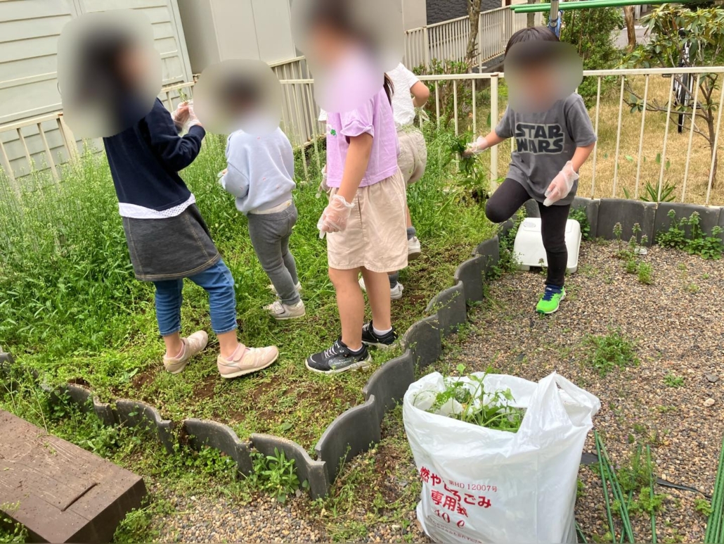 早速みんなで草取りしました。子どもたちにとっては草取りも遊びのようで楽しそうでした♪