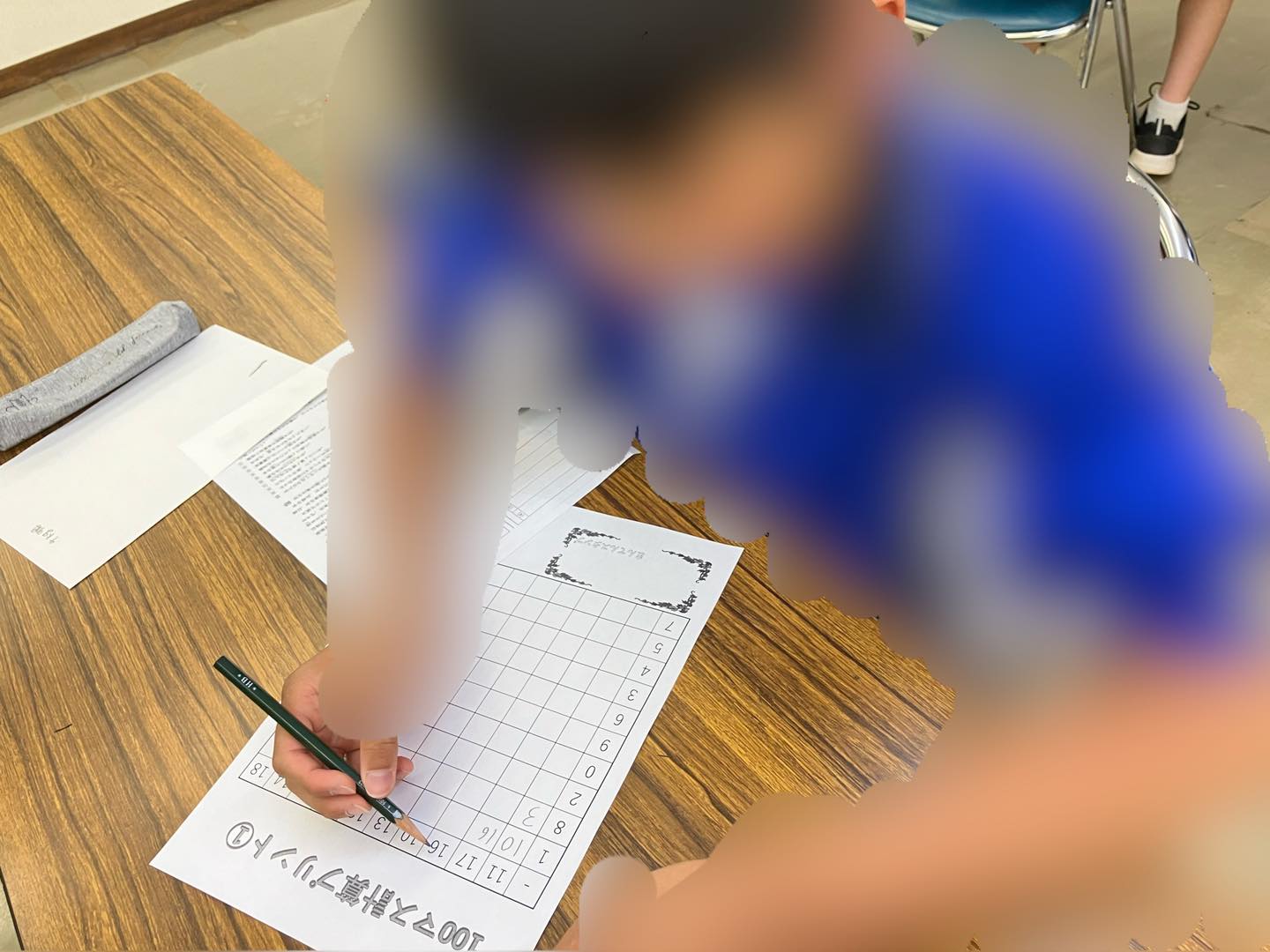 子どもたちが解いた問題を、コーチが丸つけしております。何人もの子どもを担当していると丸つけがたまってしまうので、コーチたちはせっせと丸つけしております。
