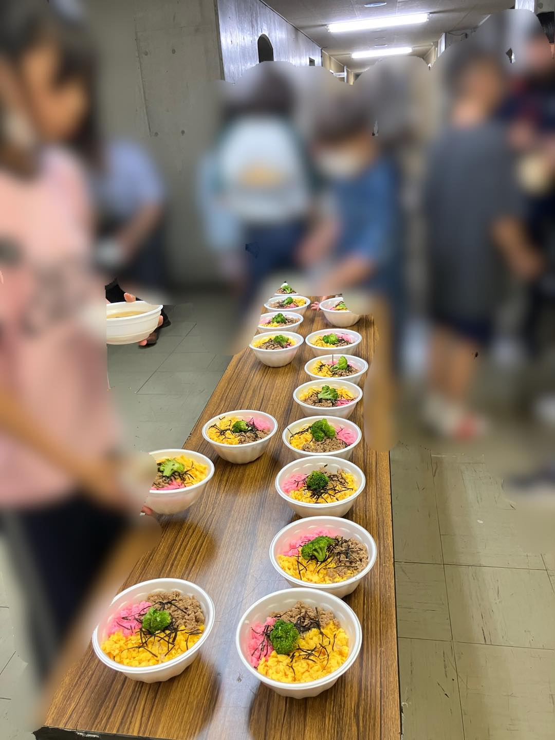 夕飯はひまわり食堂様ご提供の3食丼と味噌汁等。cafe smile lab 様がサツマイモのドーナツをご寄付くださいました。美味しいデザート、子どもたちはとても喜んでいます。