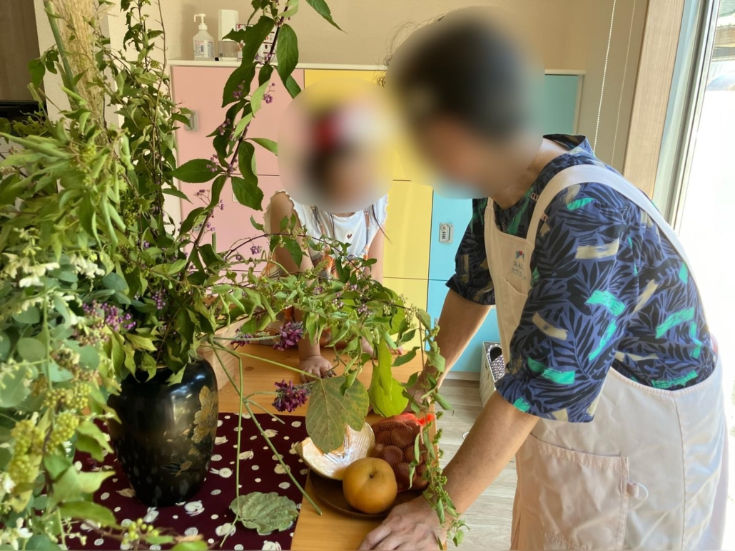 スタッフが持ってきた草花、葛や白萩、紫式部やススキを飾り、季節の果物野菜をお供えしました