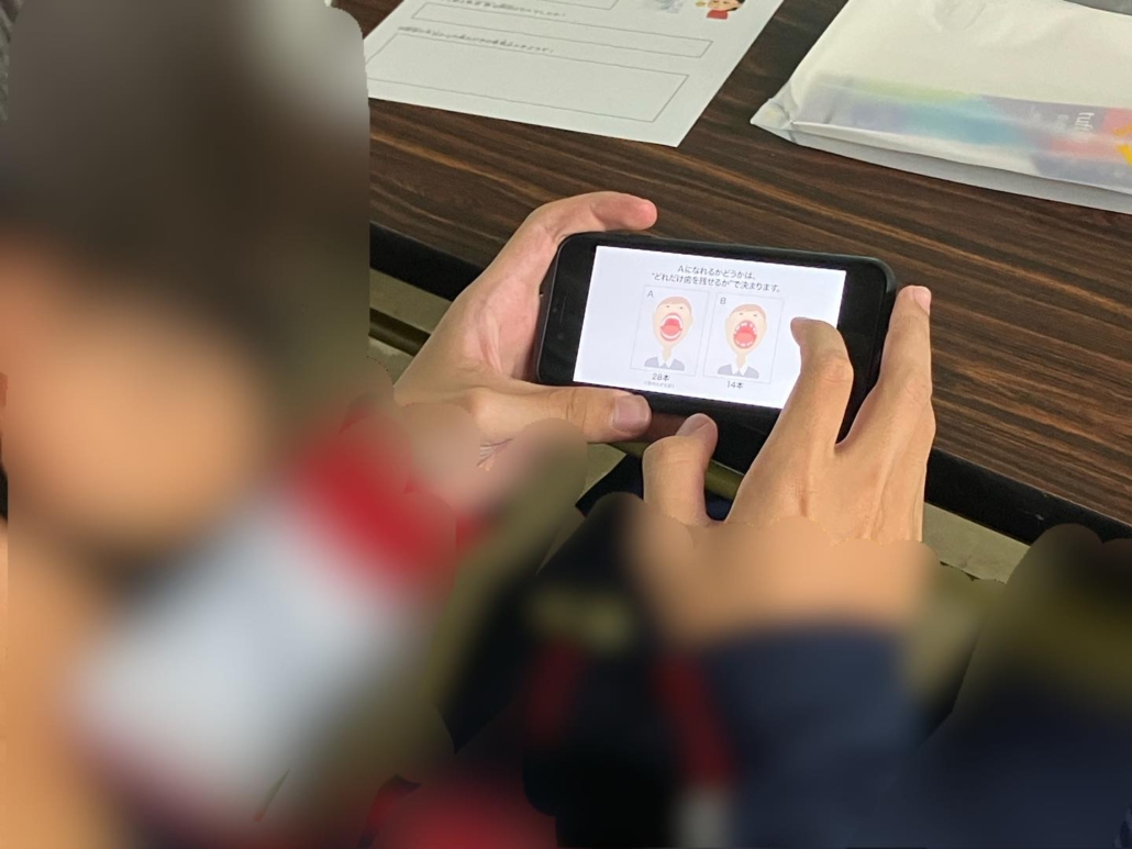 子どもたちは歯周病の匂いを嗅いでみたり、アプリを使って、80歳になった時の顔診断をしたり、実際に歯を磨いたり、様々な体験を通して口腔ケアを学びました。