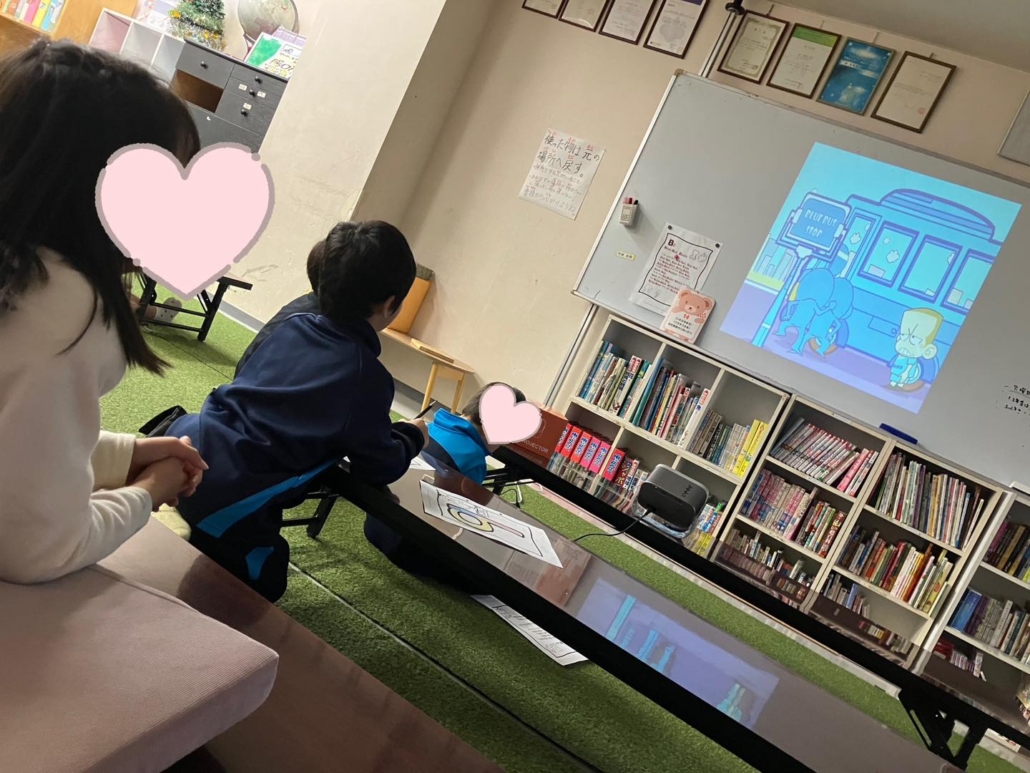 児童たちは、ポップな絵柄の英語のビデオを集中して見ていました