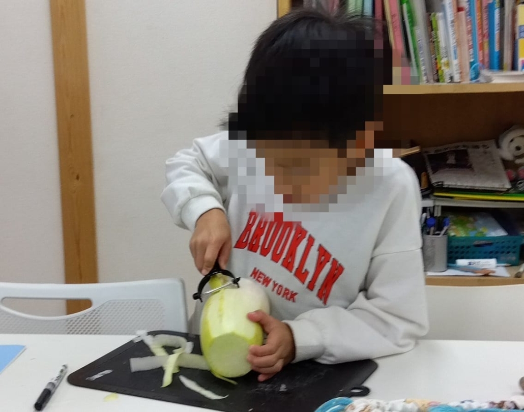 小学三年生の男の子が、大きな大根を2本、ピーラーで皮むきのお手伝いをしてくれました
