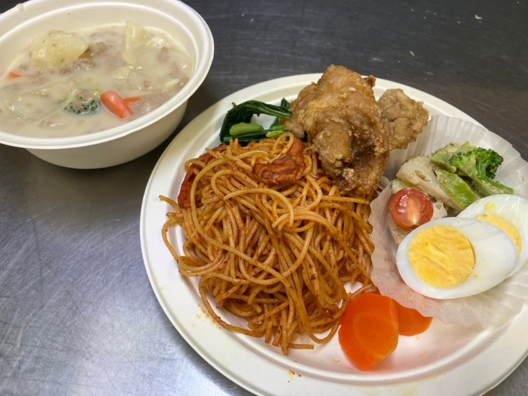 ご飯はGチェリー様によるスパゲッティ、唐揚げ、ホワイトシチュー。大人でもびっくりなボリューム。