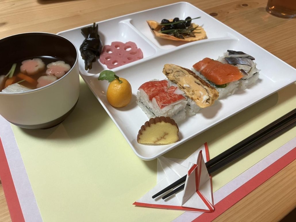 夕飯はお正月特別メニューでお雑煮や押し寿司などを出しました。