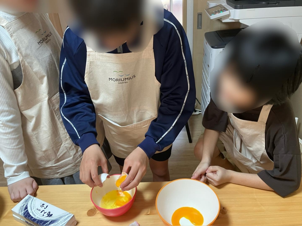 卵を卵黄と卵白に分けるのを失敗したり、再チャレンジしたり、鋭い包丁を怖がりつつも鰹を切るのを楽しんでいました。