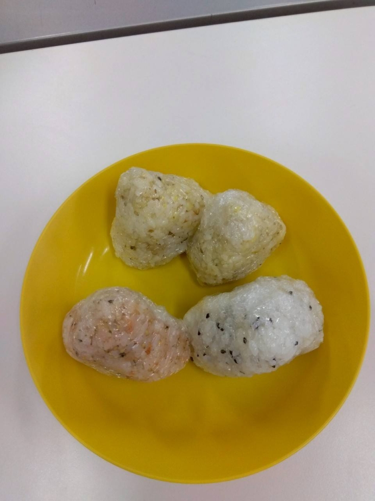 今日のおやつは、おにぎりと大根、にんじん、ネギ、ソーセージ入りのコンソメスープです。