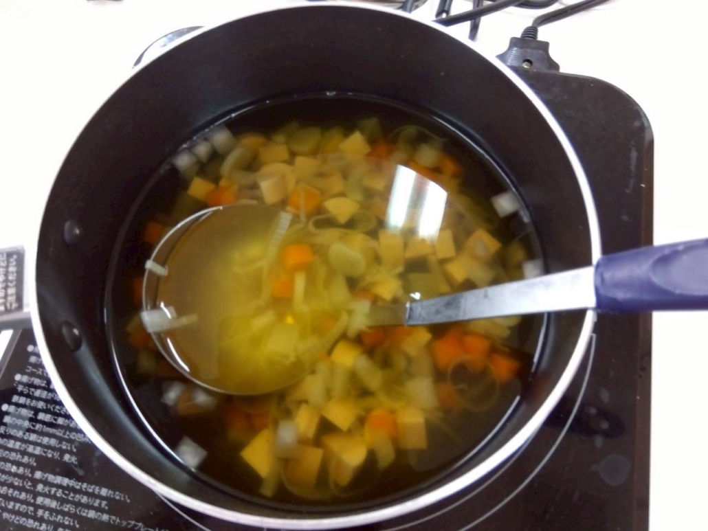 今日のおやつは、おにぎりと大根、にんじん、ネギ、ソーセージ入りのコンソメスープです。