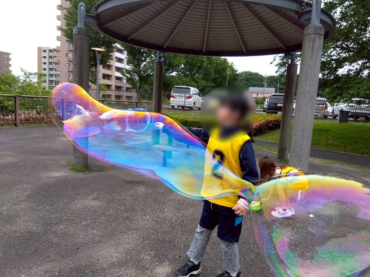 今日は夕方になっても気持ち良い天気だったので、近くの公園で、シャボン玉を飛ばして遊びました。