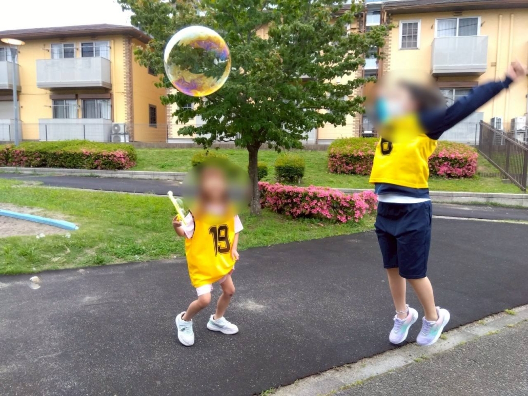 今日は夕方になっても気持ち良い天気だったので、近くの公園で、シャボン玉を飛ばして遊びました。