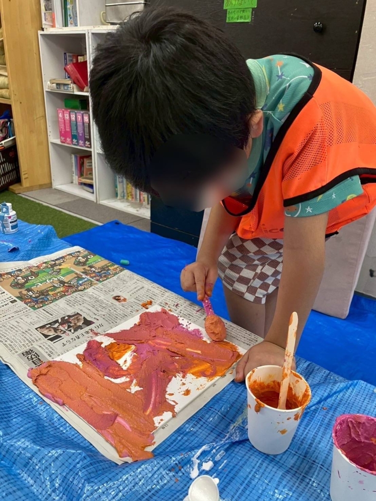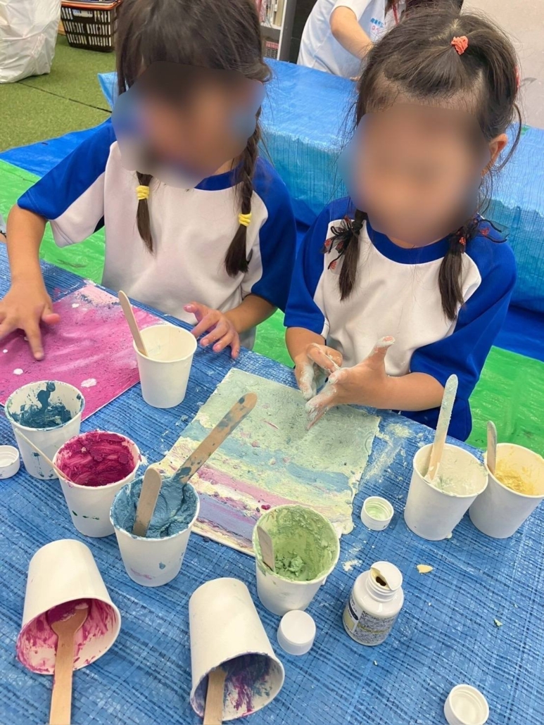 子どもたちは自分の好きな色を混ぜて、ふわふわのアートを作り出しました!