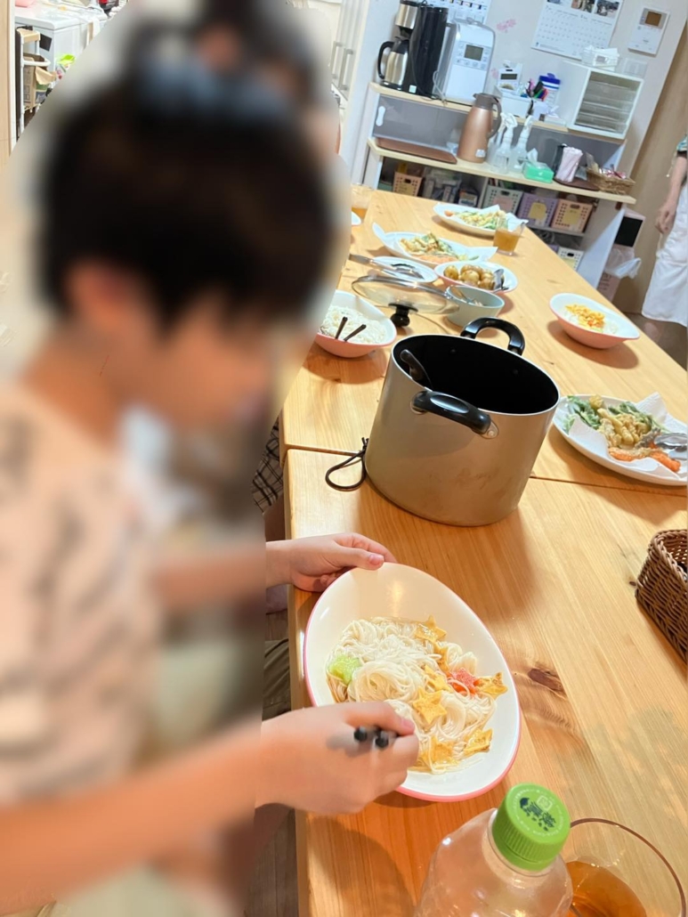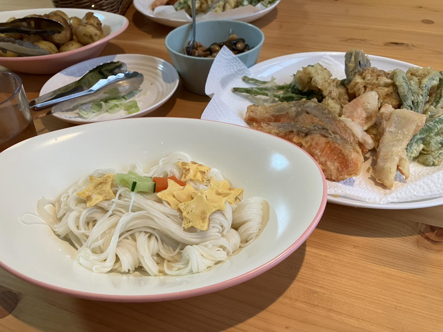 夕飯は七夕メニューで星型のきゅうり、にんじん、卵がのったそうめんです。