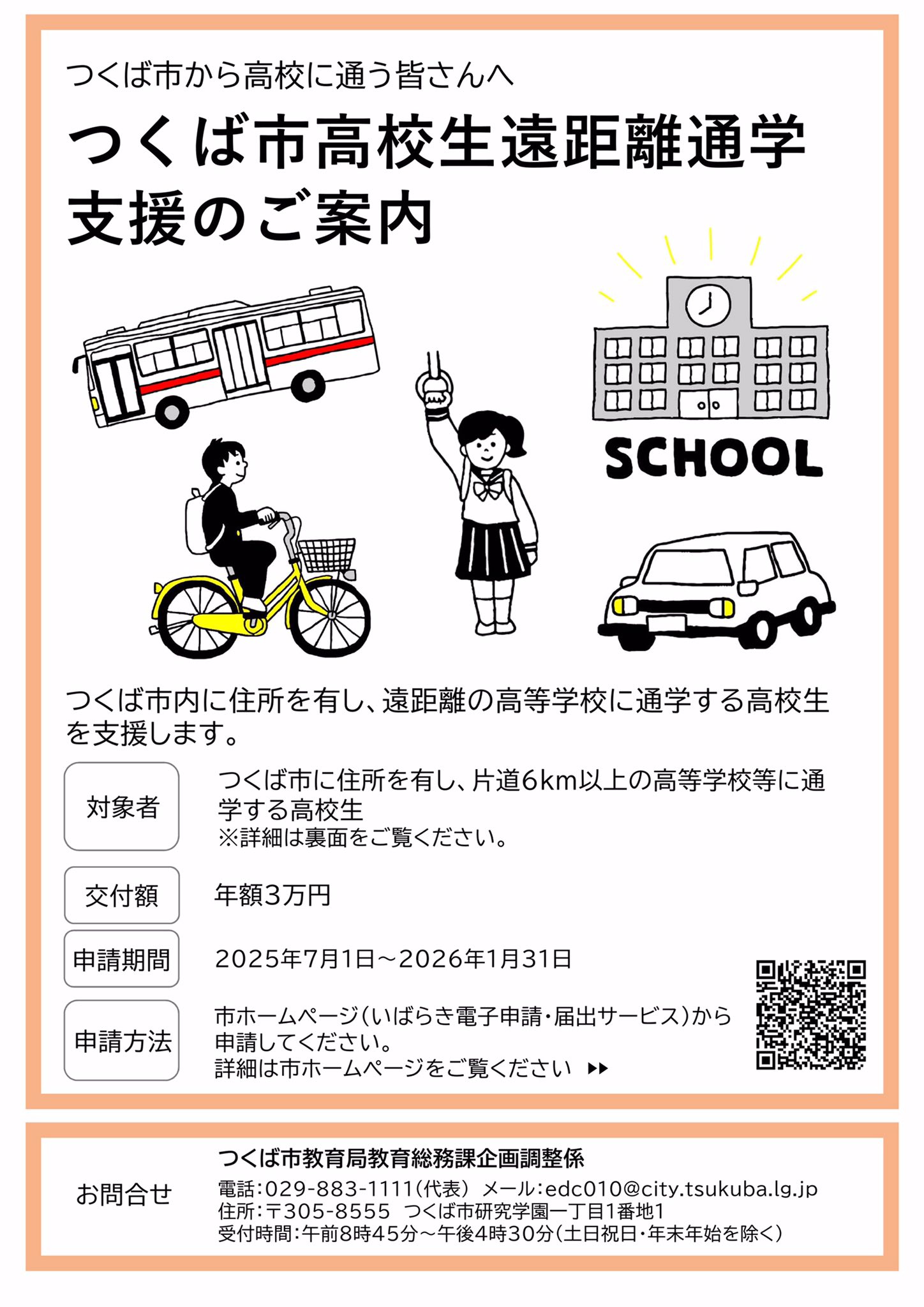 つくば市に住所を有し、高等学校等までの通学距離が片道6km以上である方が対象です。