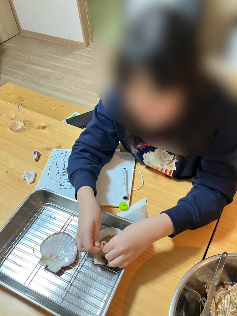 殻を開き、貝ひも・内臓・貝柱に分ける作業も楽しんでいて、『もっとやりたい‼︎』と楽しんで取り組む姿が印象的でした