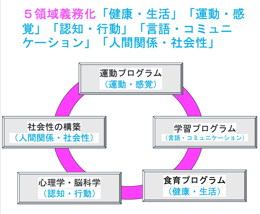 子ども達に必要な運動、学習、食育、心理学・脳科学、社会性の構築など5つの療育を柱に、バランスの取れた支援を実施していきます。
